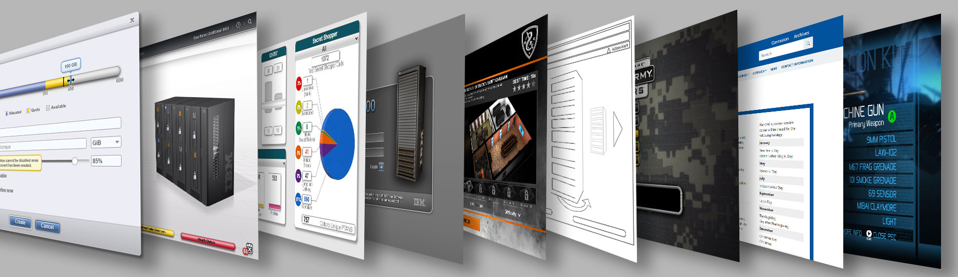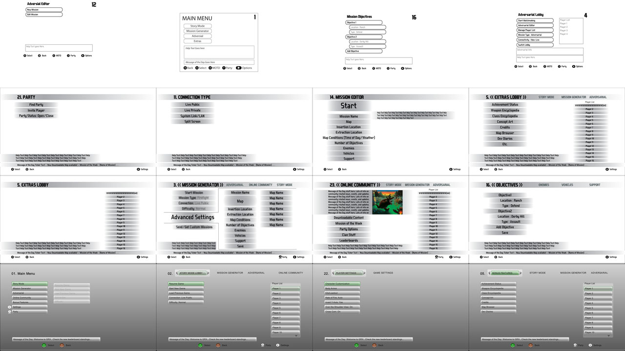 Game screens created for Ghost Recon X and America’s Army: True Soldiers. Screens include screen flow document, wireframes, gray models, and prototype screens that were fully interactive for user testing.