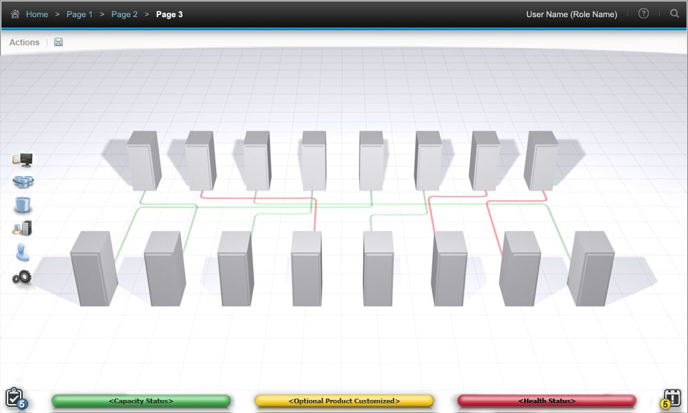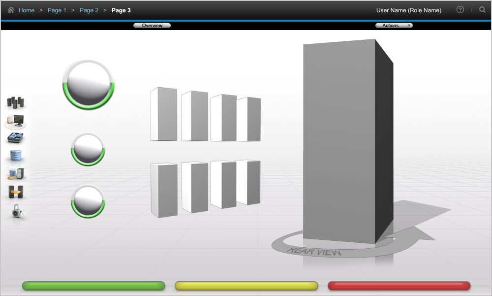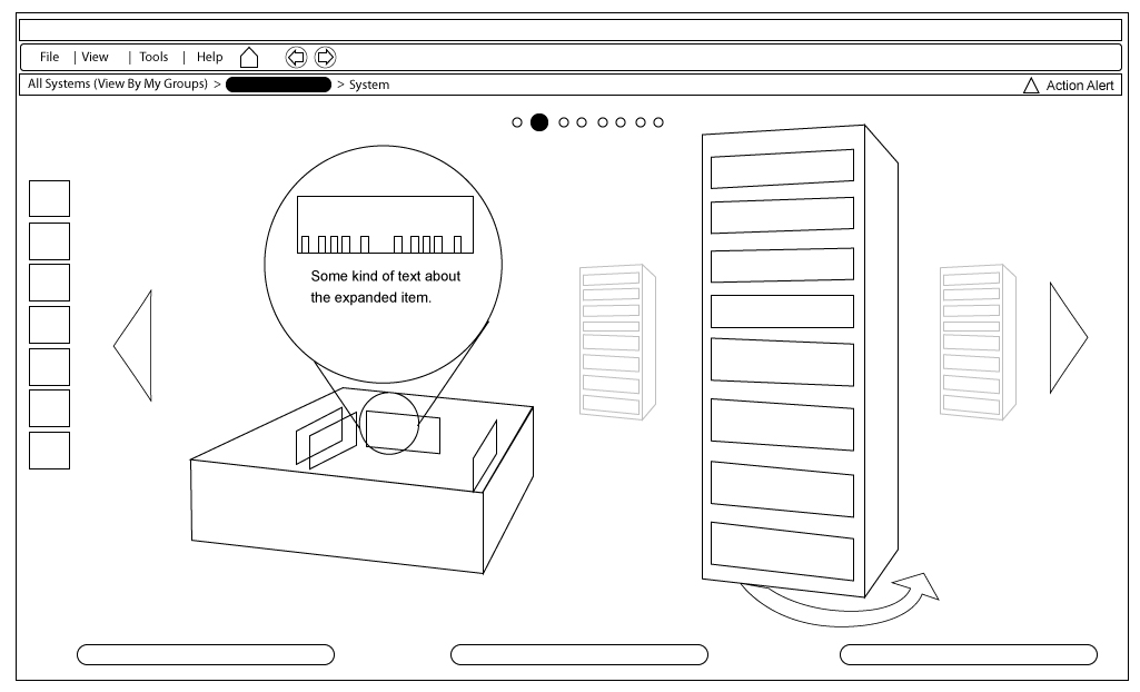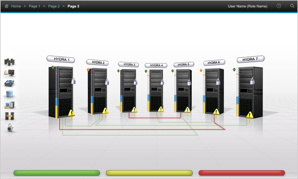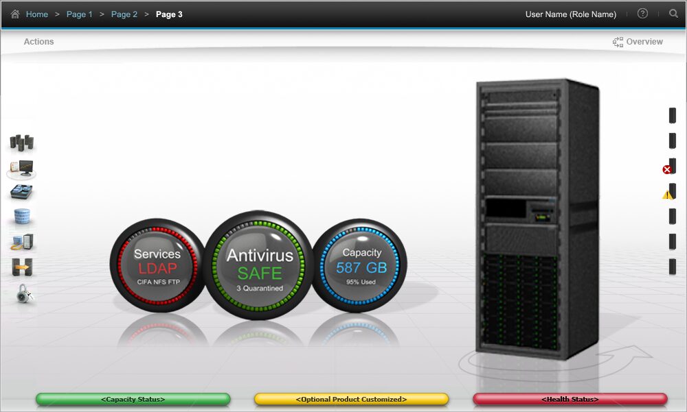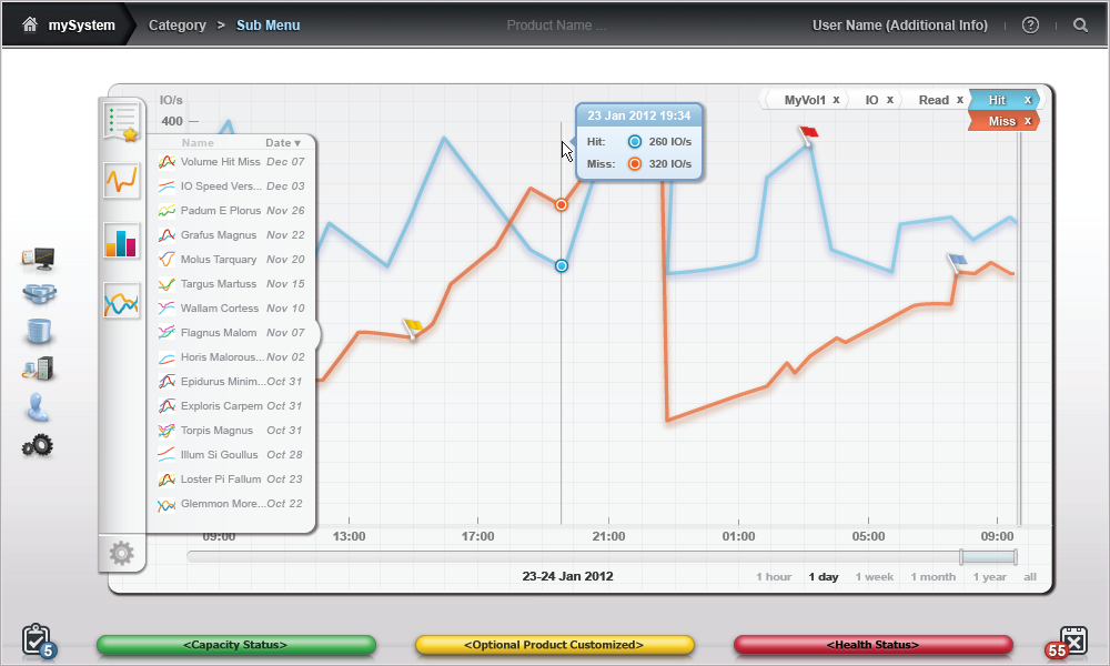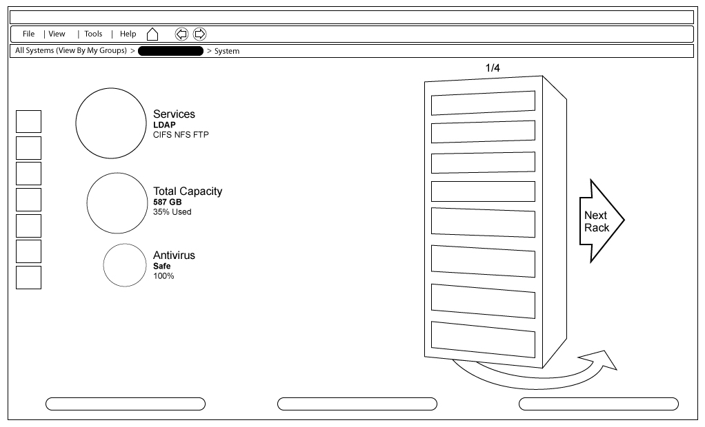 Login, system status, data charts and general menus designed for IBM System Storage. Includes wireframes, gray models and final graphics.