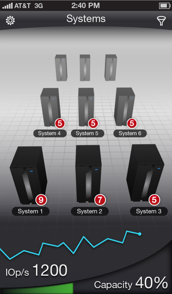 Mobile screens created as part of IBMs very first mobile app designed to monitor storage systems and give status updates.