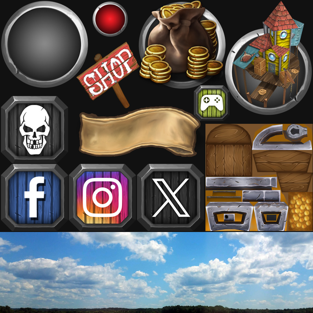 Title screen, logo, button and graphic assets for Shooty Seas mobile game